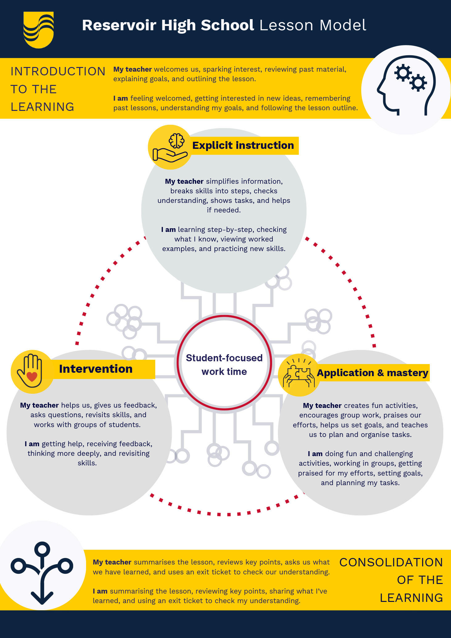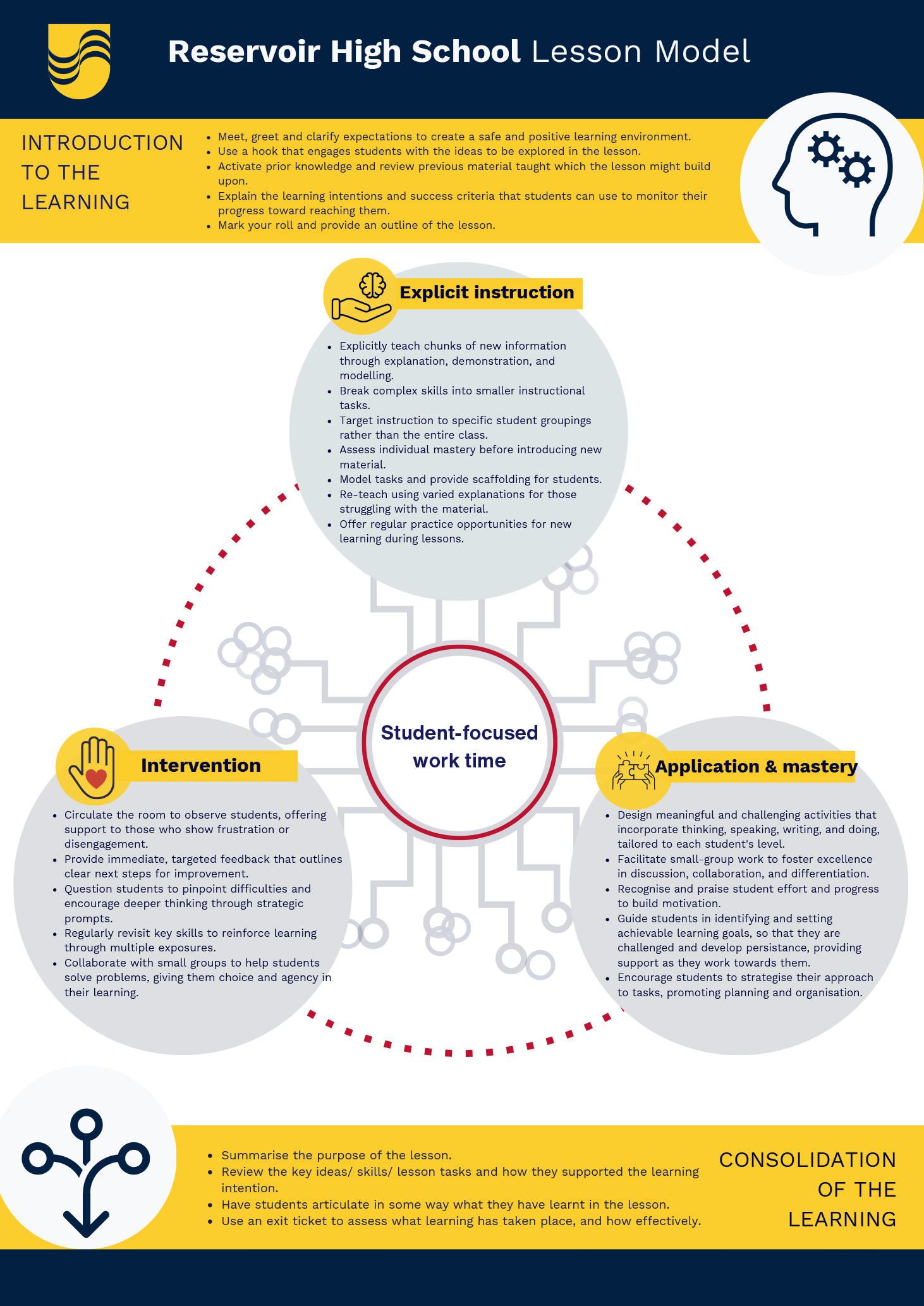 At its core, the model emphasizes student-focused work time, allowing for flexibility as sections can be revisited and integrated at various points throughout the lesson. Synthesised from the High Impact Teaching Strategies, the High Impact Wellbeing Strategies, and the Victorian Teaching and Learning Model 2.0, this lesson model not only aims to enhance academic achievement but also supports the overall wellbeing of our students. It’s important to have a structured lesson model because it provides a consistent and effective framework for teaching and learning, ensuring that each lesson is purposeful, engaging, and tailored to meet the diverse needs of our students. We invite our dedicated Reservoir High School community to embrace this model as a tool for empowering students and fostering a collaborative, supportive, and high[1]achieving learning community. Together, let’s make every lesson a step towards excellence and a testament to our shared commitment to education.